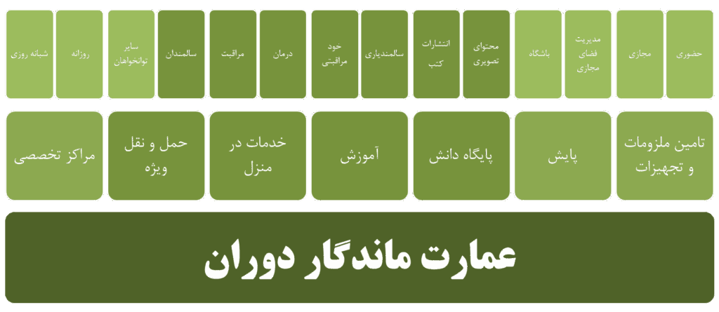 • تولید محتوی فیزیکی (کتب) و الکترونیکی مورد نیاز برای اشاعه دانش خود مراقبتی و سلامت و نشاط سالمندی